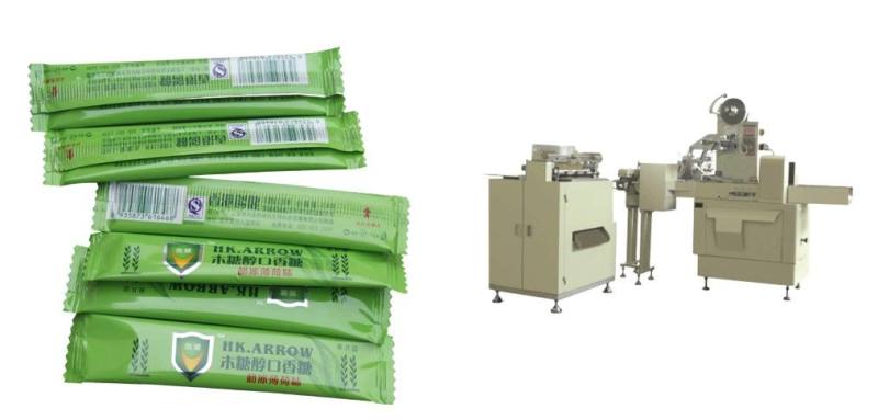 Упаковочная машина для однослойных подушек используется для упаковки жевательной резинки в палочки.